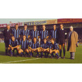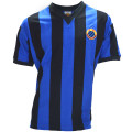 Maillot rétro noir et bleu du FC Bruges, plus tard rebaptisé Club Bruges, qui partage historiquement avec le Anderlecht la position de leader du football Belge. Après avoir bien réussi pendant les années 20, le club entre en régression jusqu'aux années 60 quand il remporte finalement la Coupe face au Beerschot. Il décroche également cette compétition en 1970, cette fois face au Daring. À la fin des années 60 et début des années 70, le Bruges termine cinq fois de suite à la deuxième place au Championnat belge; l'équipe était mûre mais il lui fallait un saut définitif pour devenir le leader du tableau. Les joueurs les plus réputés de l'époque furent Fernand Goyvaerts, Raoul Lambert, Erwin Vandendaele et Fons Bastijns. L'équipement du Club a subi plusieurs changements; pendant les années 70 le maillot était complètement bleu mais actuellement il a récupéré les rayures classiques.